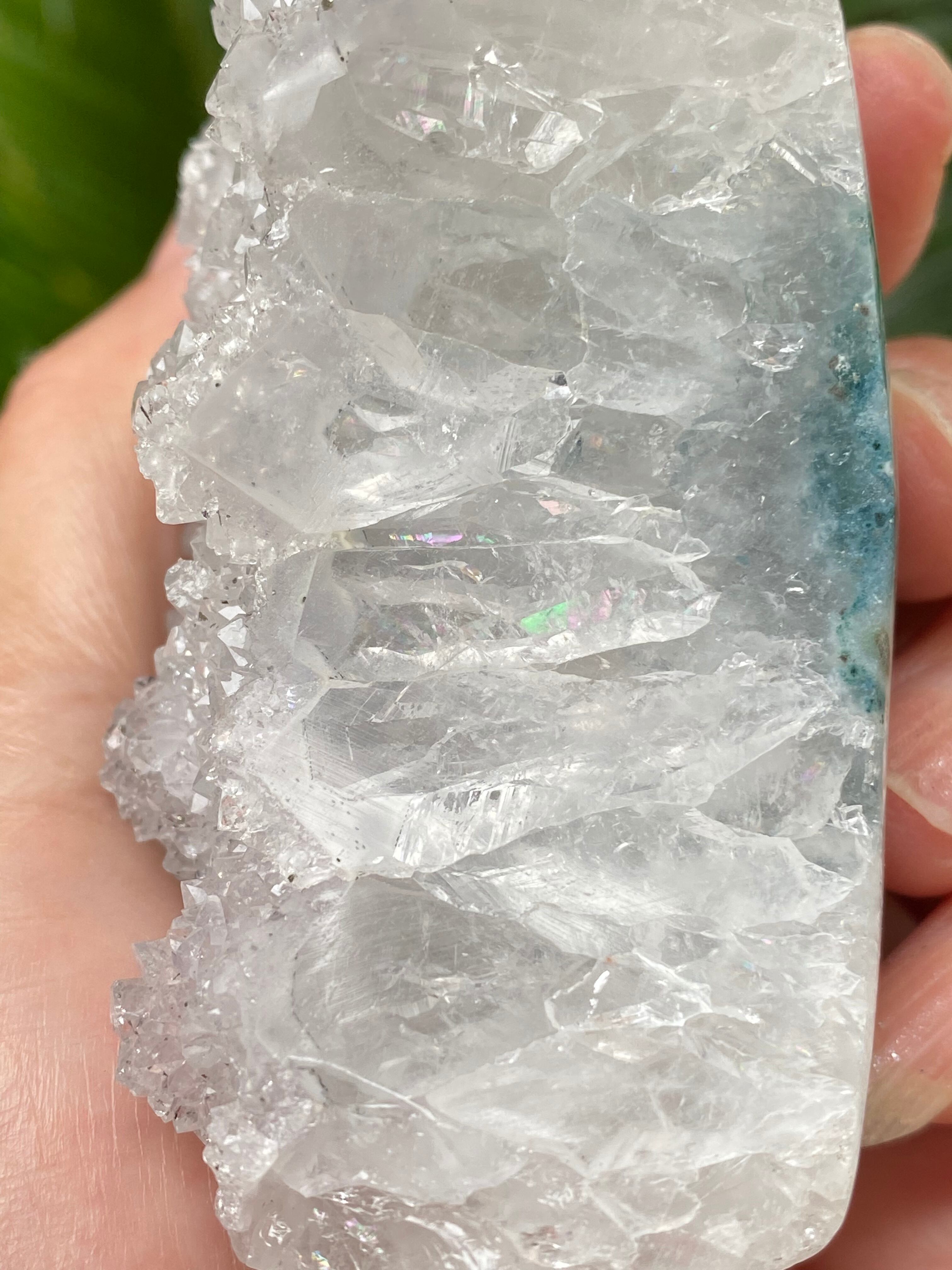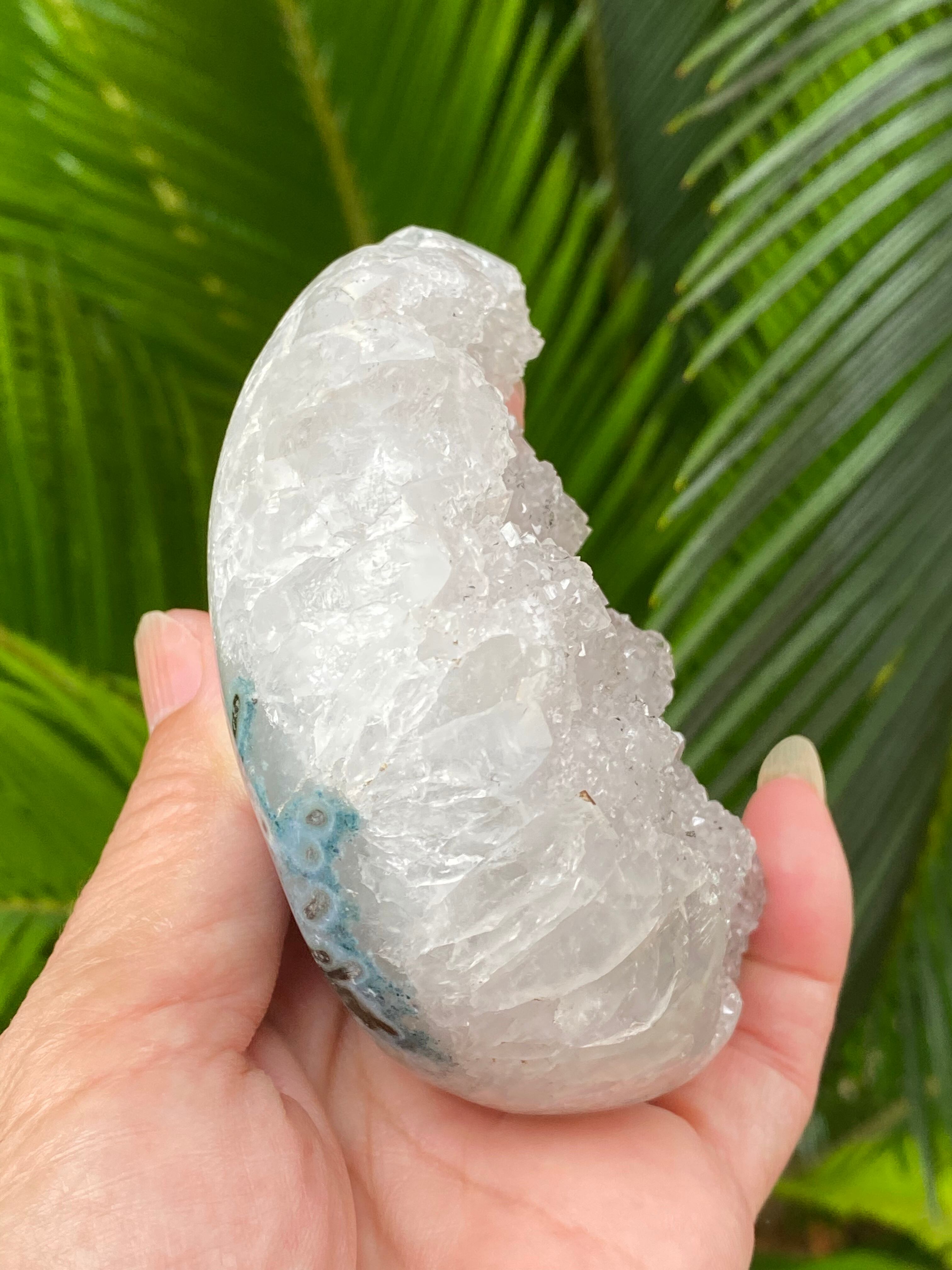 小さな結晶が集まった、三日月形をしたレインボー入り原石です