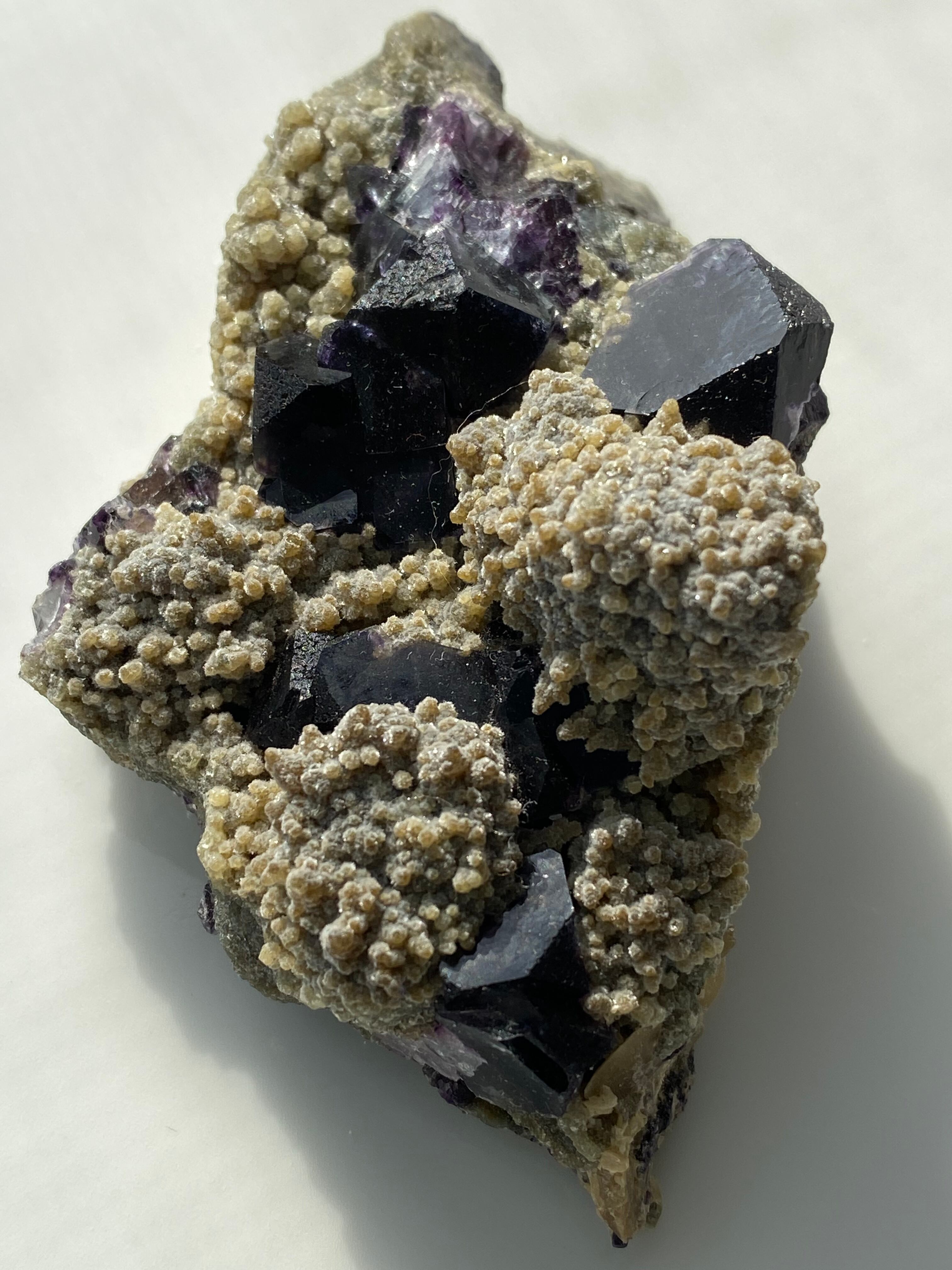 珍しいブラックフローライトと貴賓あるパープル、ウグイス色の小さなフローライトの美しい結晶が特徴的。