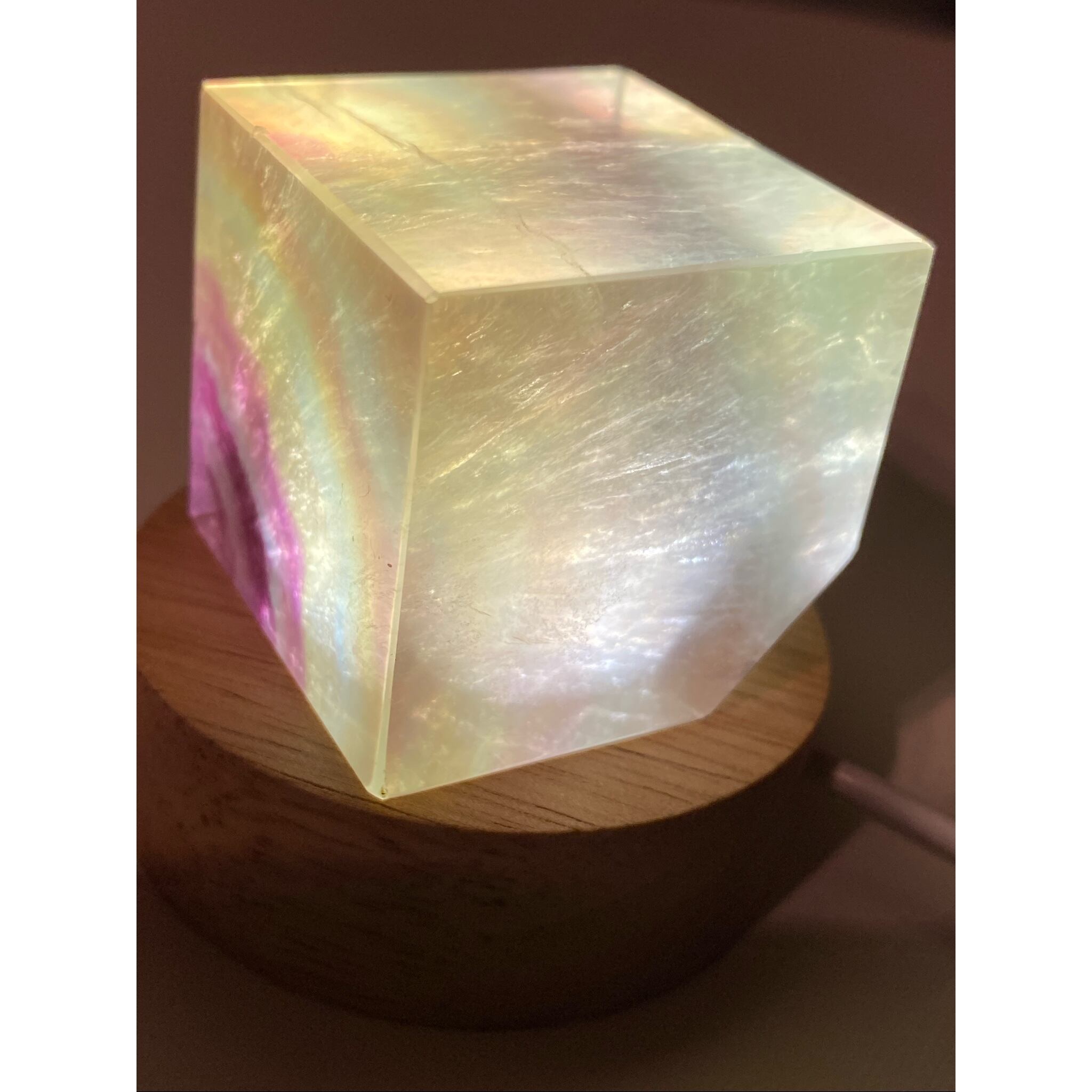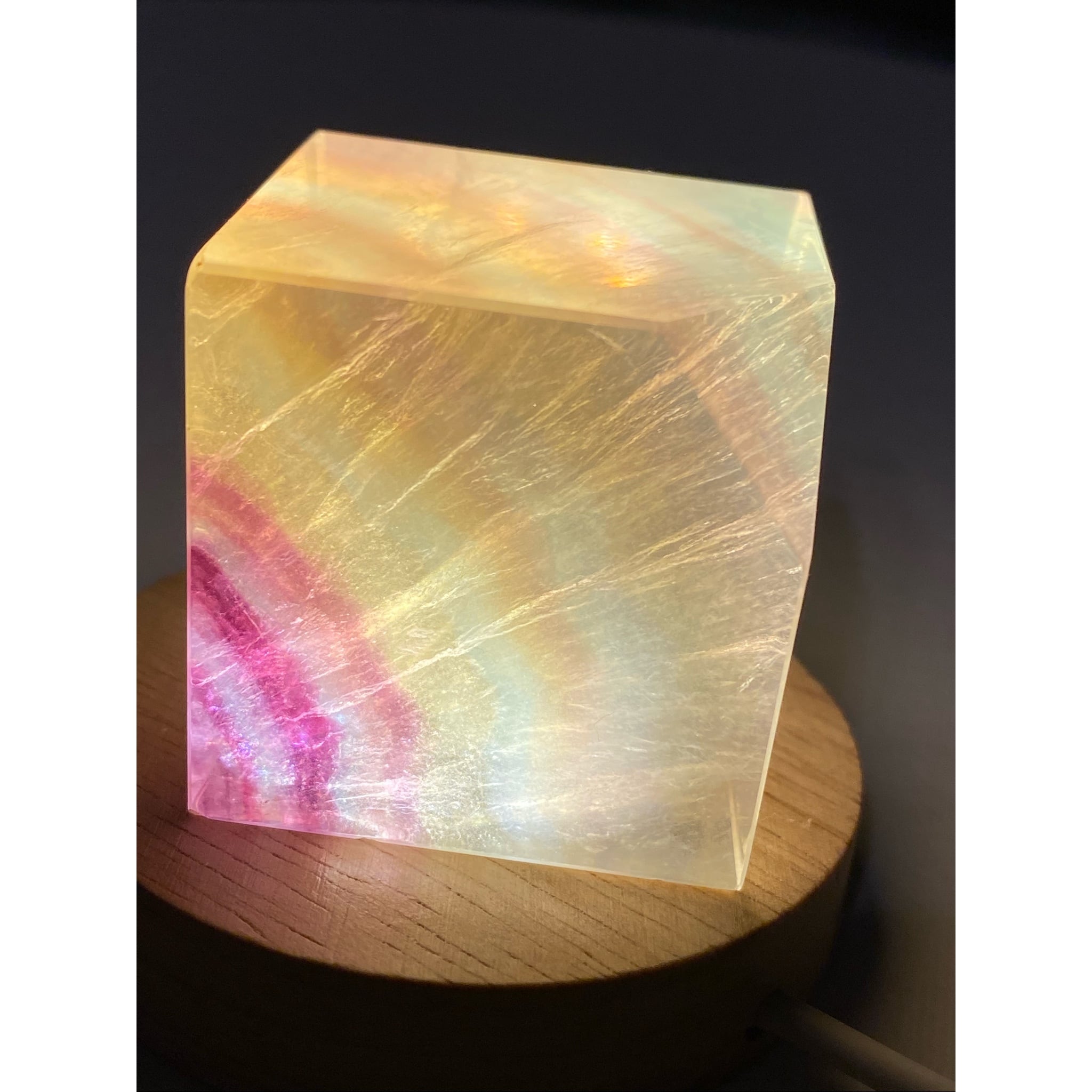 キューブ状のデザインに、幻想的な色彩のフローライトが詰まっています。