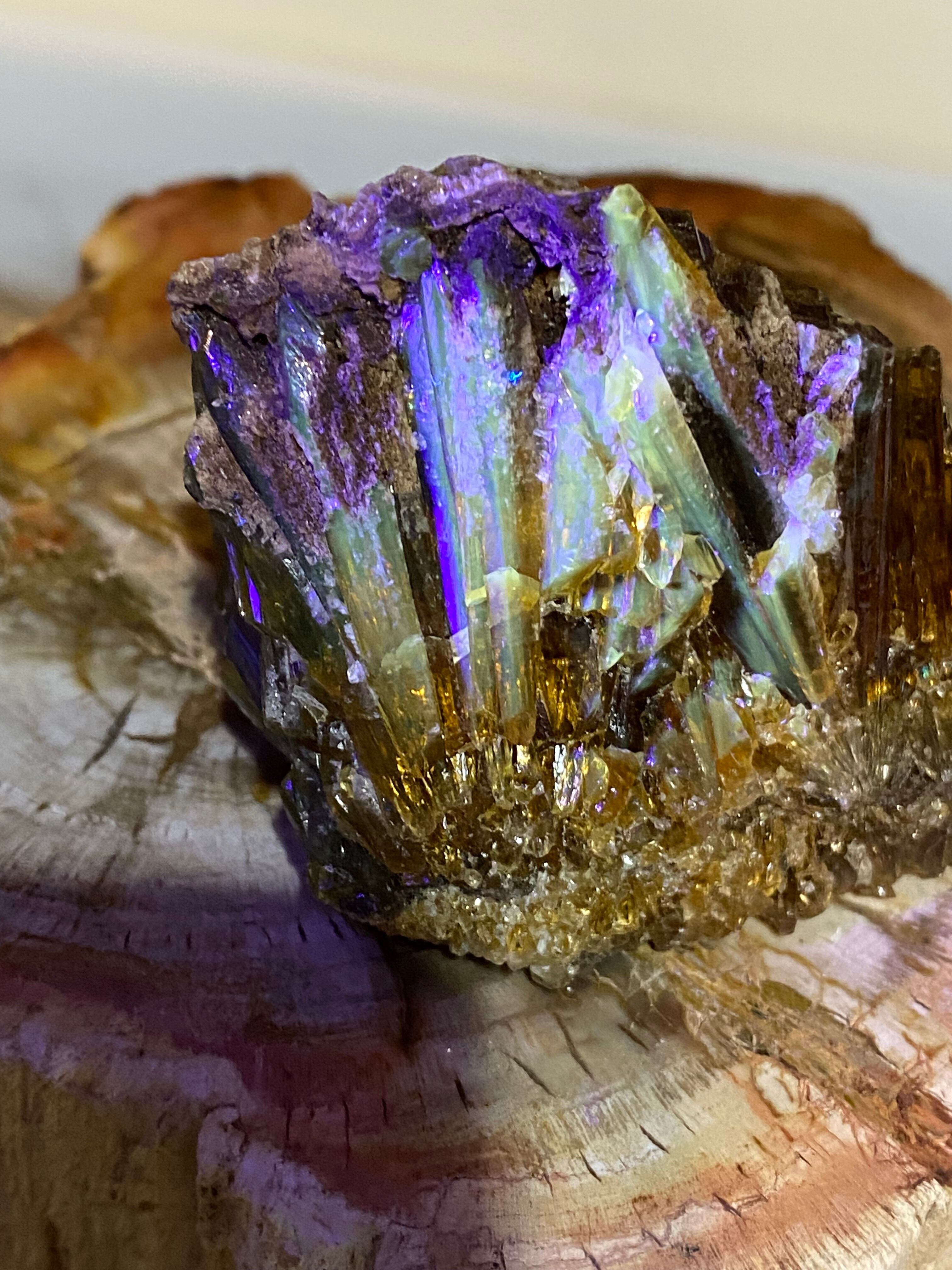 無数の細いポイント状の結晶が寄り添い、重なり合いながら形成されたシルエットが特徴的で、横から見ると艶やかな透明度も見られます。